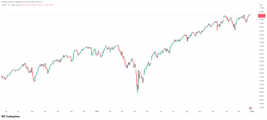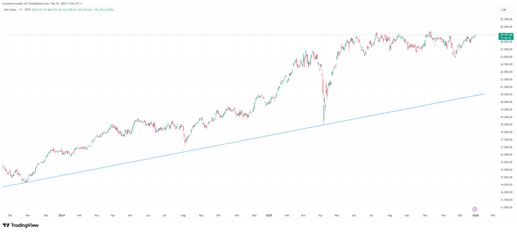 Am vorletzten Handelstag des Jahres präsentieren sich die Märkte ausgesprochen ruhig, aber weiterhin mit einem klar positiven Grundton. Der DAX tritt am Vormittag weitgehend auf der Stelle und pendelt knapp unter seinem Jahreshoch, während die großen US Indizes nach einem außergewöhnlich starken Börsenjahr nahe ihrer Rekordstände konsolidieren. Das Umfeld ist damit typisch für den Jahresausklang: dünne Liquidität, geringe Nachrichtenlage und ein Markt, der eher technische Marken und Orderflow als neue Fundamentalfaktoren spielt.